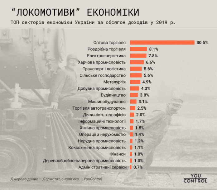 Ведущими секторами украинской экономики по выручке в 2019 году стали оптовая (30,5%) и розничная (8,1%) торговля.