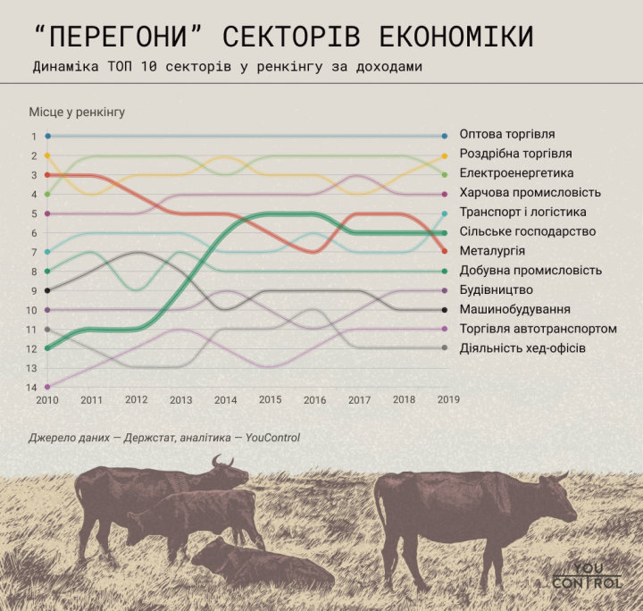 Эксперты отмечают, что — агро и металлургический сегменты украинской экономики одновременно являются крупнейшими генераторами экспортных поступлений в страну. При этом за последнее десятилетие металлургия по вкладу в общие доходы спустилась с 3-го на 7-е место, а роль сельского хозяйства — наоборот выросла: с 12 на 6 место. Оба сектора оказались наиболее динамичными в плане изменений и, можно сказать, «поменялись местами».