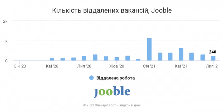 По данным Work.ua и Jooble, в апреле 2020 удаленная работа фигурировала в 7−8% от общего количества вакансий. Это вдвое больше, чем таких рабочих мест предлагается сейчас.