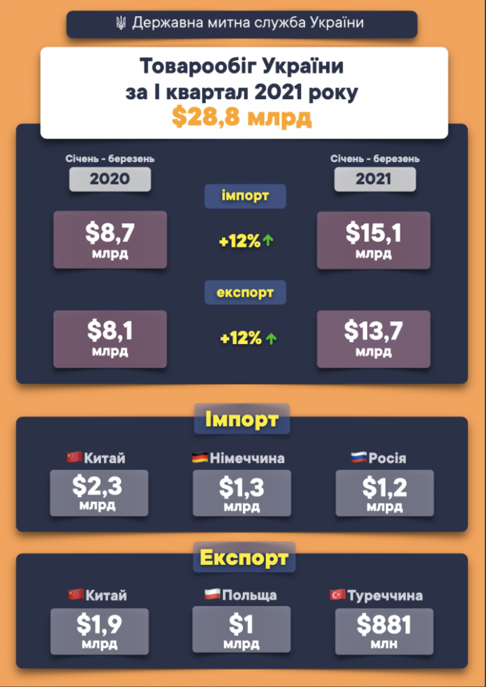 Товарооборот Украины за первые три месяца текущего года составил $28,8 млрд, что на $3,1 млрд больше, чем за аналогичный период прошлого года (в январе-марте 2020 года — $25,7 млрд).