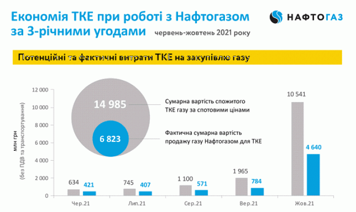 «За 5 месяцев действия трехлетних договоров поставки природного газа общая экономия средств производителей тепловой и электрической энергии достигла почти 10 млрд грн. Именно столько составляет разница между летней ценой ООО «Газопоставляющая компания «Нафтогаз Трейдинг» и средними котировками украинского рынка в июне-октябре», — говорится в сообщении.
