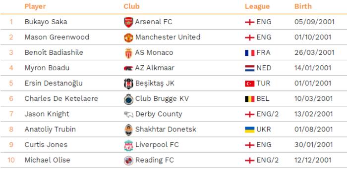 19-летний вратарь «горняков» занял 8-е место среди игроков, рожденных в 2001 году. Возглавил список защитник лондонского Арсенала Букайо Сака.