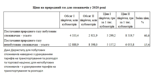 Средняя цена природного газа для бытовых потребителей во втором полугодии 2020 года составила 8 519,74 грн (с НДС и с учетом тарифов на транспортировку и распределение) за 1 тыс. куб. м. Это на 60,8% больше, чем в первом полугодии (5 299,2 грн).