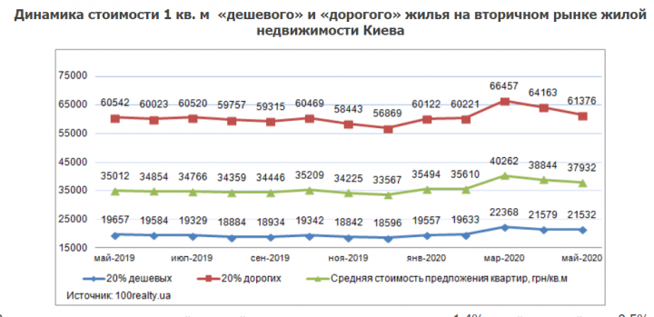 Цены на дешевое/дорогое жилье. Относительно апреля средняя цена предложения 20% квартир низкого ценового сегмента уменьшилась – на 0,2% до 21532 грн./кв.м и в 20% квартир высшего ценового сегмента – на 4,3% до 61376 грн./кв.м.