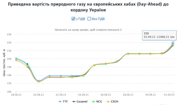 Цена на газ в Европе с поставкой на главном хабе Европы – TTF в Нидерландах – 1 сентября составляла около 632,33 доллара за тысячу кубометров, с доставкой до границы Украины без НДС цена достигает 677,65 доллара.