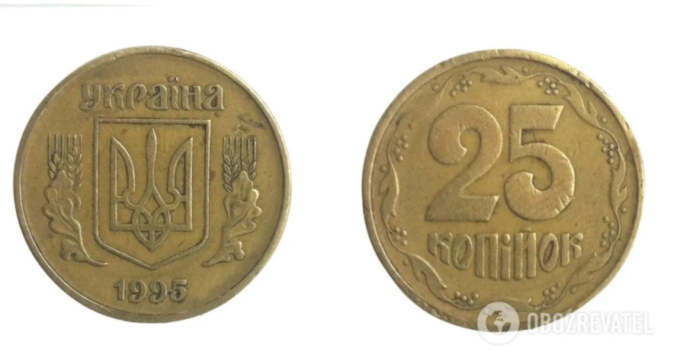25 копеек 1995 года встречаются нечасто, поэтому они так дорого стоят. Здесь не нужно разбираться в ягодках, ценятся любые 25 копеек 1995 года. На аукционах стоимость монеты стартует с 1000 грн и может доходить до 1800 грн.