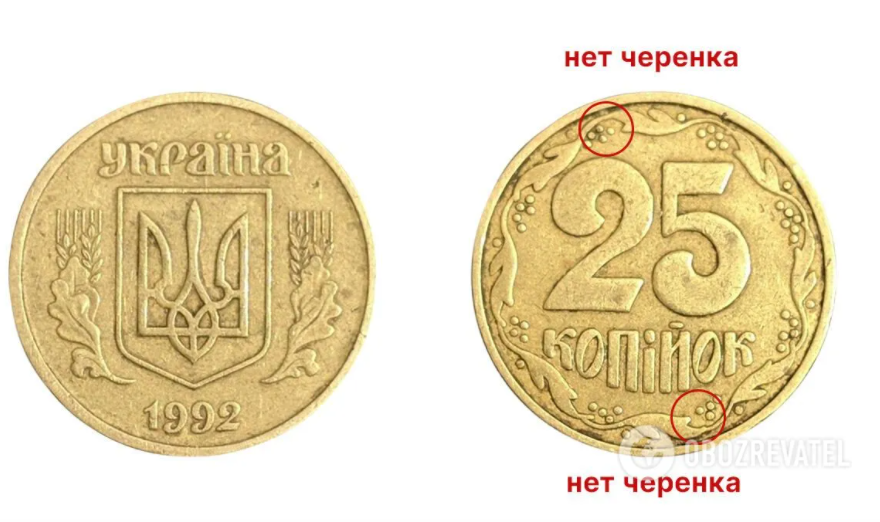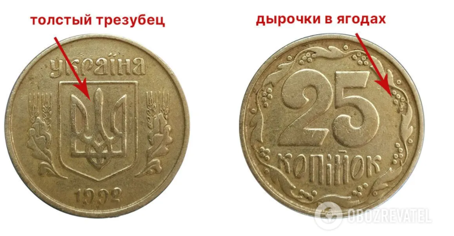 25 копеек 1992 года, особенность: ягоды с отверстиями, толстый трезубец. Цена: 100-150 грн