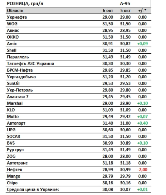 По данным мониторинга, средние розничные цены на бензин А-92 составляют 29,24 гривен за литр (+0,01 гривен), на бензин А-95 — 30,08 гривен за литр (+0,01 гривен), на дизельное топливо — 28,83 гривен за литр (+0,05 гривен), на автогаз — 17,87 гривен за литр (+0,01 гривен).