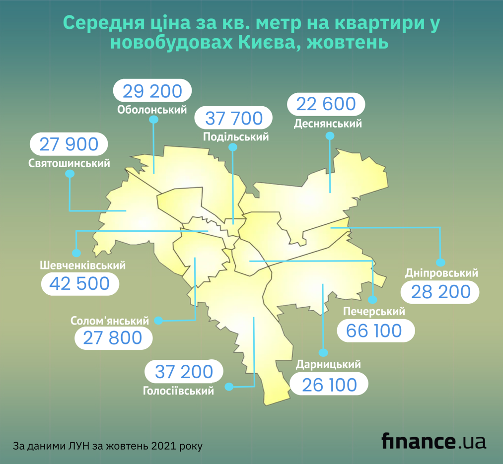 Шевченковский район подорожал на 1 300 грн – 42 500 грн/кв. м. Квадратный метр в Святошинском районе стал дороже на 900 грн – 27 900 грн/кв. м, в Оболонском квадрат добавил 500 грн – 29 200 грн/кв. м.