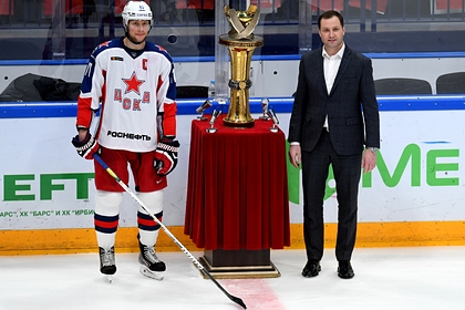 Глава КХЛ Алексей Морозов (справа) и игрок ЦСКА Сергей Андронов с Кубком Континента