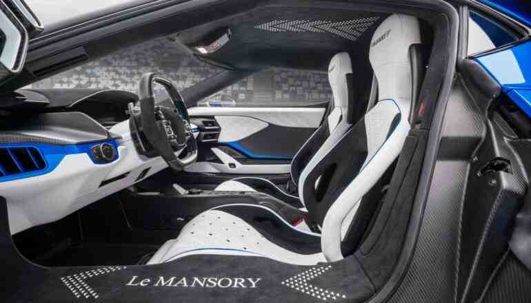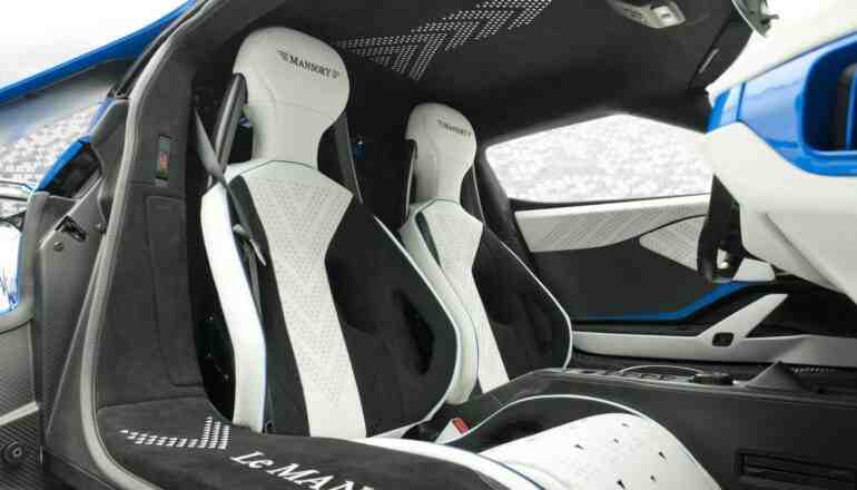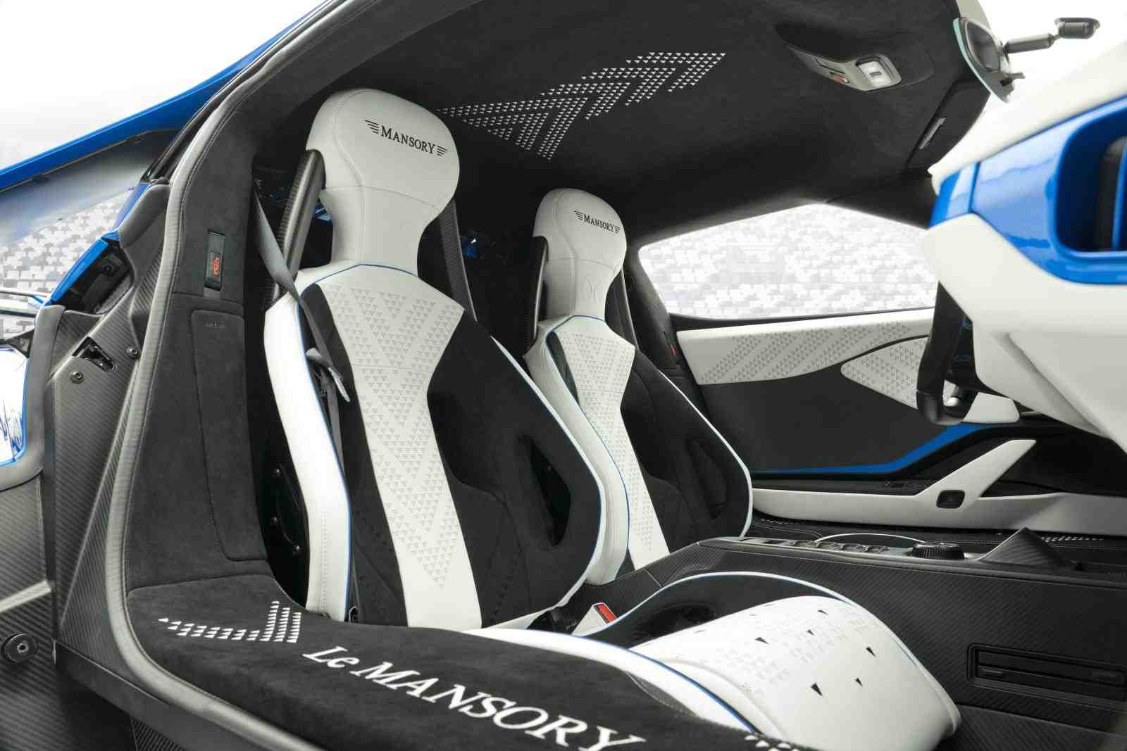 Не забыли специалисты ателье и об интерьере Le Mansory, который теперь выглядит роскошно. В салоне установили спортивные сиденья. Все поверхности спорткара отделали алькантарой в бело-черно-синих тонах, которые дополняют вставки из углеродного волокна.