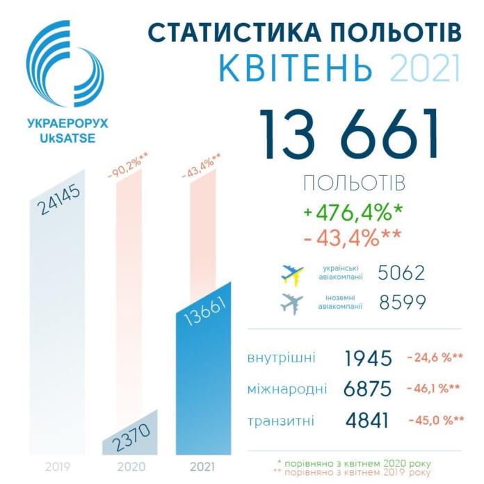 Отмечается, что по сравнению с апрелем 2020 года, когда в Украине действовали карантинные ограничения и были прекращены полеты гражданской авиации, в апреле 2021 года количество авиарейсов выросло на 476,4%.