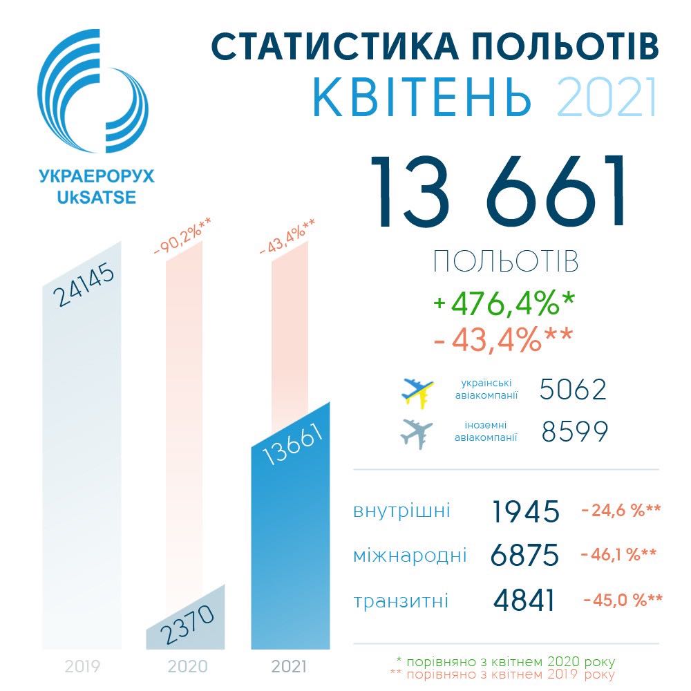 В прошлом месяце украинские авиакомпании выполнили 5 062 полета, что на 40,8% меньше по сравнению с апрелем докризисного 2019 года, а иностранные авиакомпании в апреле выполнили 8 599 полетов (на 44,9% меньше). По типам полетов воздушный трафик распределяется так: внутренние рейсы — 1 945 (на 24,6% меньше по сравнению с апрелем 2019 года), международные рейсы — 6 875 (-46,1%), транзитные рейсы — 4 841 (-45%).