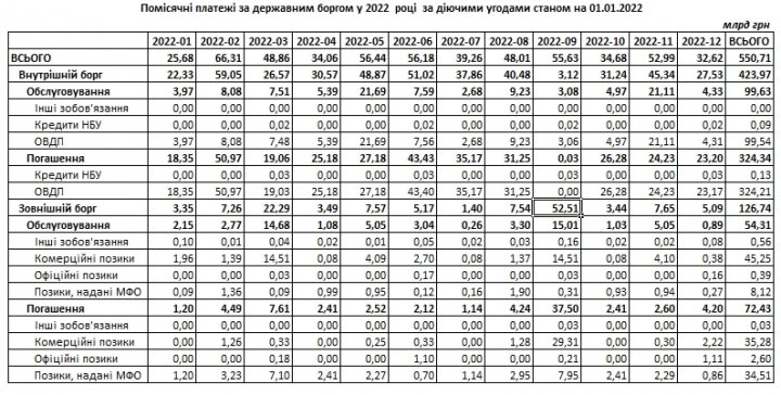 Министерство финансов Украины обнародовало график помесячных платежей по государственному долгу по действующим договорам по состоянию на 1 января 2022 года. За год необходимо выплатить 550,71 млрд гривен, в т. ч. по внутреннему долгу – 423,97 млрд гривен, по внешнему – 126,74 млрд гривен.
