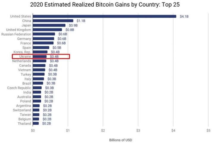 По оценкам Chainalysis, украинские трейдеры в совокупности заработали порядка $ 400 млн в виде полученной прибыли в Bitcoin в прошлом году. Исследовательская фирма из Нью-Йорка опубликовала отчет, в котором перечислены 25 стран — лидеров в данной категории.