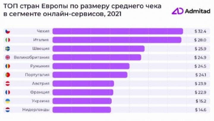 Украина вошла в топ-10 стран Европы по среднему чеку на оплату сервисов в интернете