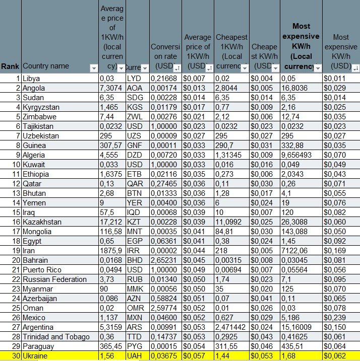 Украина заняла 30 место в рейтинге стран по стоимости электричества, составленном компанией Cable.co.uk. Средняя цена 1 кВт⋅ч по стране составляет 1,56 грн ($0,057), а ценовой “потолок” – 1,68 грн ($0,062).