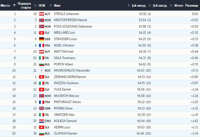 Из всех участников успешно первый заезд преодолели только 52 горнолыжника. Лучший результат показал австриец Йоханнес Штрольц, который в Пекине уже выиграл золото в комбинации.
