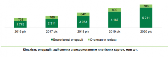 Так, количество безналичных платежей за прошлый год выросло на 25,1% до 5 211,2 млн шт. (86,9% от общего количества), а сумма — на 22,8% и достигла 2 208,7 грн (55,8% от общей суммы операций по картам).
