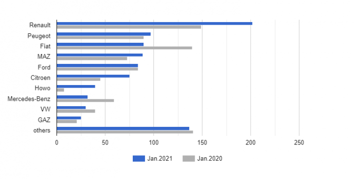 На втором месте Peugeot – 97 машин. Регистрации новых коммерческих автомобилей этой марки подросли на 8% относительно января 2020 года.