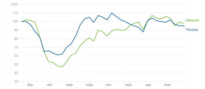 Рынок труда в октябре несколько охладился после активного сентября. За месяц еженедельное поступление новых вакансий упало на 8%, а новых резюме стали публиковать на 4% меньше по сравнению с концом сентября. Наибольшее падение новых вакансий – в сфере ресторанного и гостиничного бизнеса, а также в сфере обслуживания.