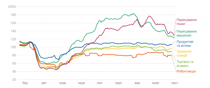 Население Украины за последнюю неделю сократило передвижения на автомобилях или пешком на 4%. За последний месяц этот показатель составил 14%.