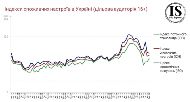Индекс потребительских настроений в Украине в июле 2020 года составил 66,7 п., что на 1,7 п. выше, чем в июне. Ожидания украинцев относительно курса гривны в течение ближайших 3 месяцев существенно ухудшились: индекс девальвационных ожиданий вырос на 19,1 п. – до значения 161,8.
