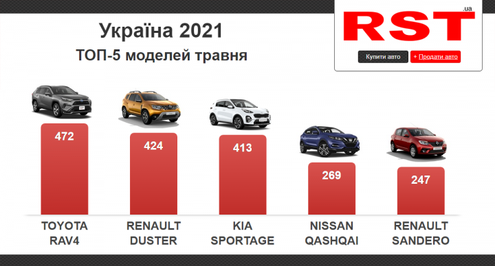 Самой популярной маркой в мае была Toyota. Украинцы купили более 1 100 таких автомобилей на сумму более 40 млн долларов. Кроссовер Toyota RAV4 стал бестселлером среди моделей и покрыл почти 6% продаж. Кроме него часто покупали Renault Duster и Kia Sportage.