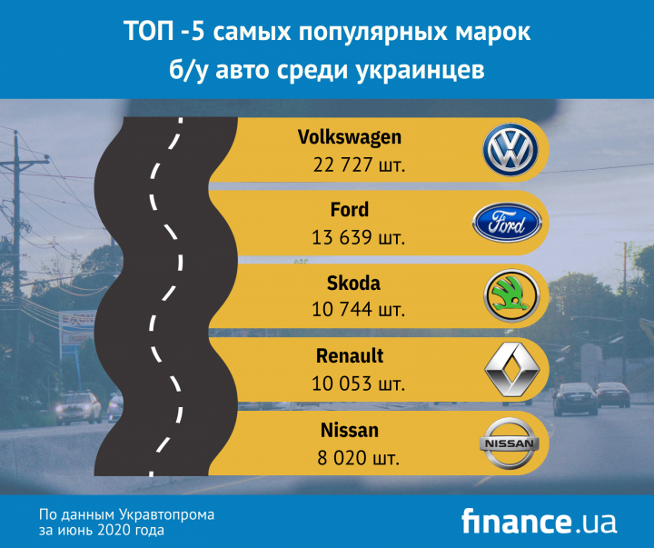 лидер – Volkswagen. С января по июнь 2020 года украинцы поставили на учет 22 727 импортированных авто Volkswagen не первой свежести, что в 24 раза больше, чем новых автомобилей этой же марки;