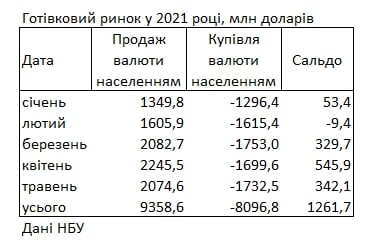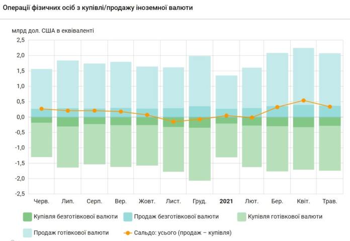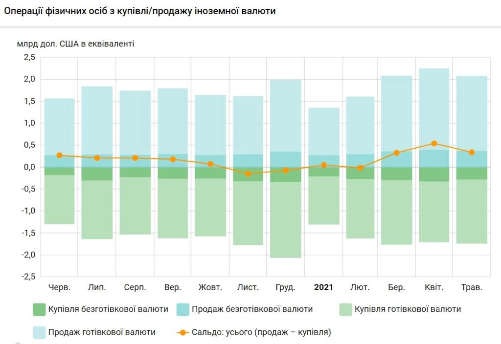 Население Украины в мае 2021 года продало коммерческим банкам наличной и безналичной валюты на 2074,6 млн долларов (в эквиваленте) и купило на 1732,5 млн долларов. Чистая продажа валюты составила 342,1 млн долларов.