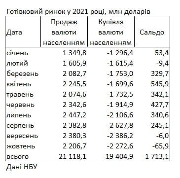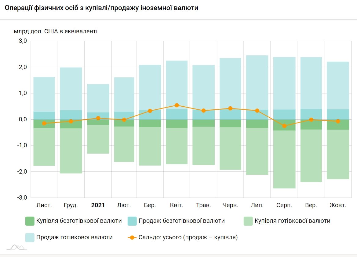 Население Украины в октябре 2021 года продало коммерческим банкам наличной и безналичной валюты на 2 206,7 млн долларов (в эквиваленте) и купило на 2 272,6 млн долларов. Чистая покупка валюты составила 65,9 млн долларов.