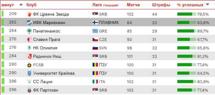 Что касается отдельных клубов, то чаще всего пенальти назначаются в ворота соперников сербской Црвены Звезды. Потом идет финский ИФК и греческий Панатинаикос.