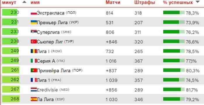 Почти такой же показатель у чемпионата Украины – УПЛ заняла «почетное» второе место 231 минутой на назначенное пенальти. Третье место у чемпионата Сербии – 233 минуты.