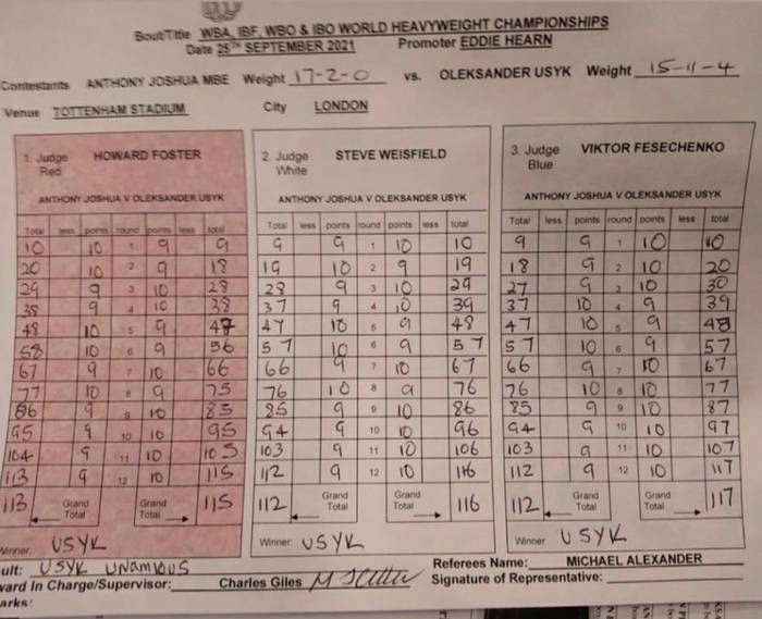 Усик победил единогласным решением судей: 117:112, 116:112, 115:113.