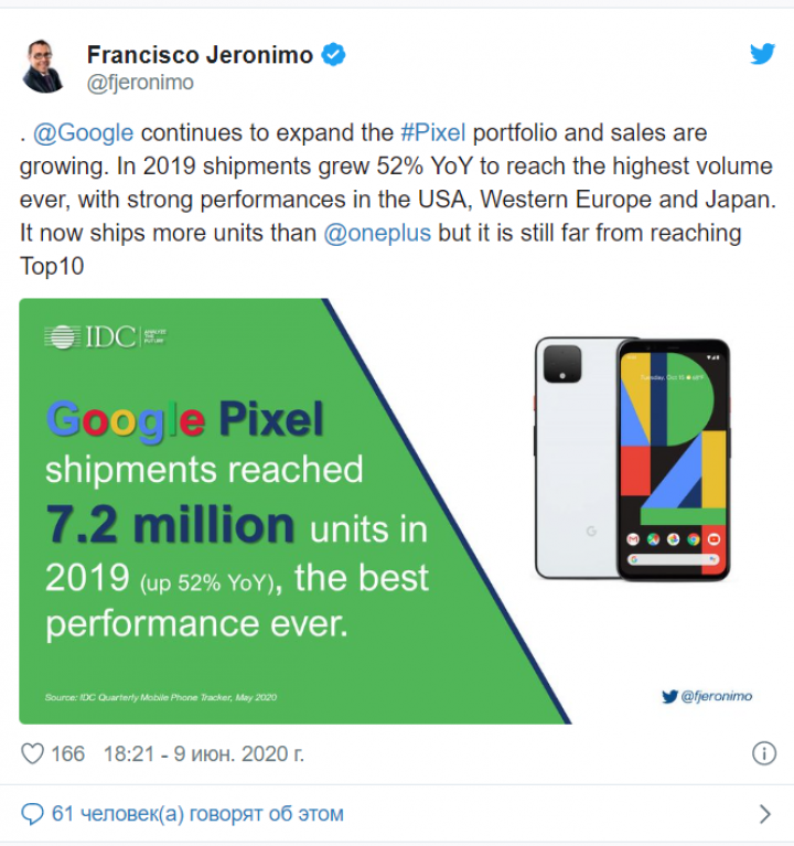Абсолютный рекорд продаж по итогам 2019 года может показаться неожиданным на фоне сообщений, что смартфоны Google Pixel 3a и Pixel 4 по итогам первого полугодия 2019 года продавались хуже, чем Pixel 3 за аналогичный период времени. Тем не менее, как отмечает IDC, в прошлом году Google расширила географию продаж тремя новыми рынками, что в сочетании с более стабильным спросом на протяжении всего года позволило выйти на такой результат.