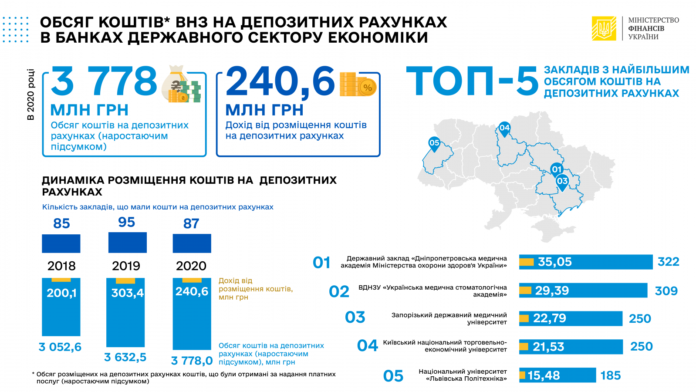 По информации Государственной казначейской службы Украины, в 2020 году на депозитных счетах в банках государственного сектора экономики в целом учреждениями высшего образования было размещено 3 778 млн грн временно свободных бюджетных средств, которые были получены за предоставление платных услуг.