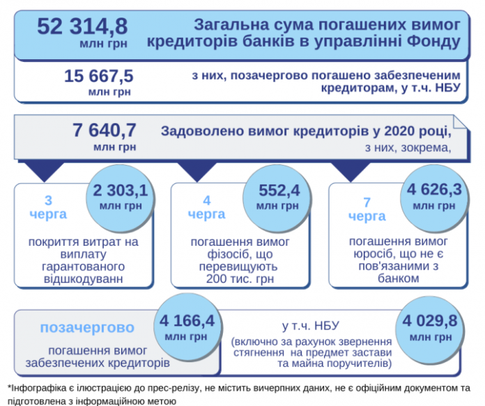 В целом по состоянию на 1 января 2021 года удовлетворено требований кредиторов неплатежеспособных банков на общую сумму 52 314,8 млн грн, из которых 15 667,5 млн грн – погашение требований обеспеченных кредиторов, в т. ч. 14 437,6 млн грн – НБУ (включительно за счет обращения взыскания на предмет залога и имущества поручителей).