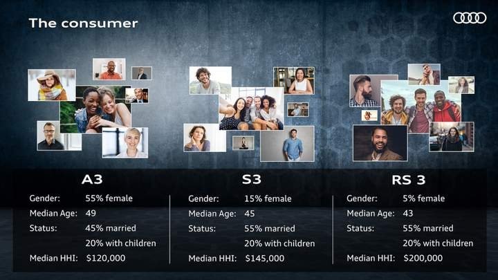 В США и Канаде стартуют продажи новых Audi A3, S3 и RS3 2021 модельного года и представительство компании опубликовало портреты покупателей для трех версий своего компактного автомобиля. Профили включали пол, возраст и семейное положение, а также средний доход домохозяйства (HHI) для каждого транспортного средства.