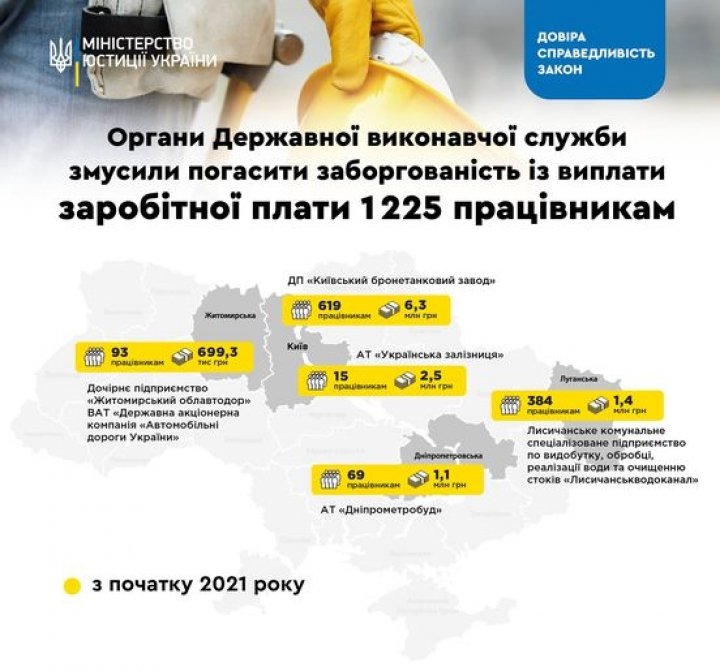 «С начала нового 2021 года государственные исполнители взыскали с недобросовестных работодателей 14,1 млн грн задолженности по заработной плате. В результате удалось вернуть 1225 работникам законно заработанные ими средства», – говорится в сообщении.