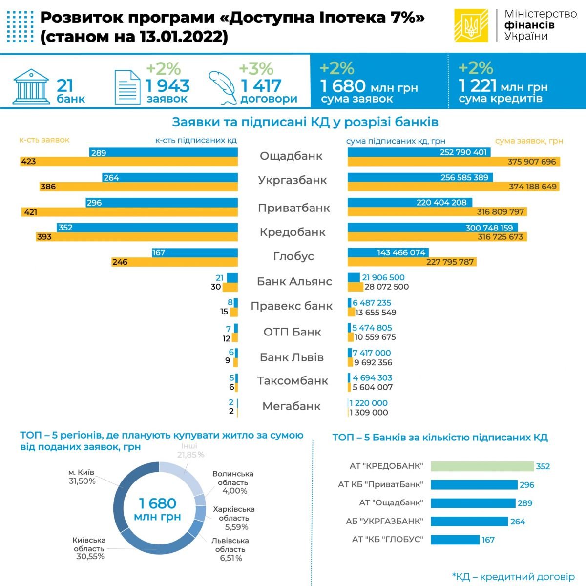 По состоянию на 13 января текущего года уполномоченными банками по выполнению Государственной программы «Доступная ипотека 7%» подписано 1417 кредитных договоров на общую сумму 1,221 млрд грн как на первичном (22,39%), так и вторичном (соответственно – 77,61%) рынках.