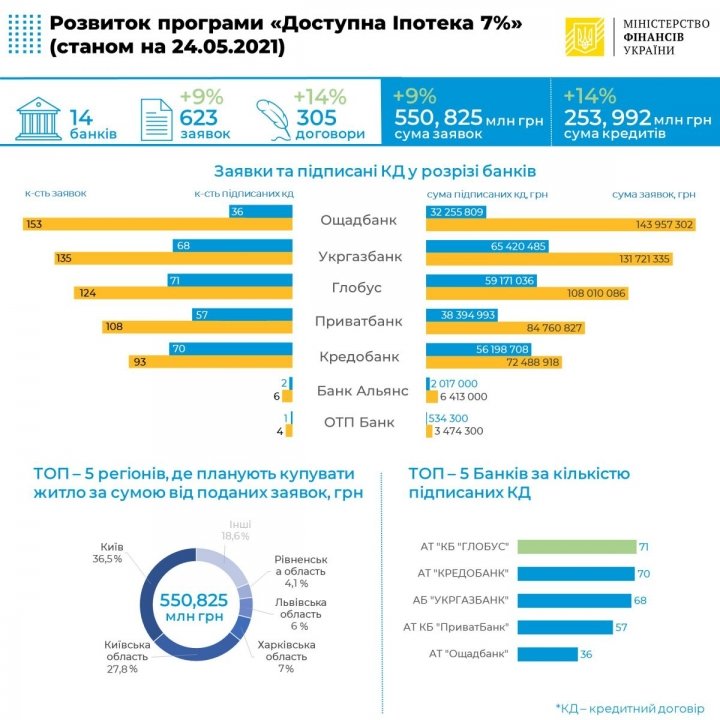 Уполномоченными банками рассматриваются 623 заявки на участие в программе на общую сумму 550,8 млн грн, из которых 21,88% составляет первичный рынок и 78,12% – вторичный.