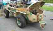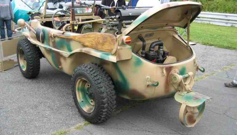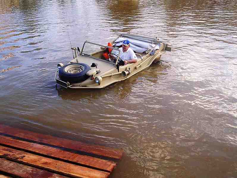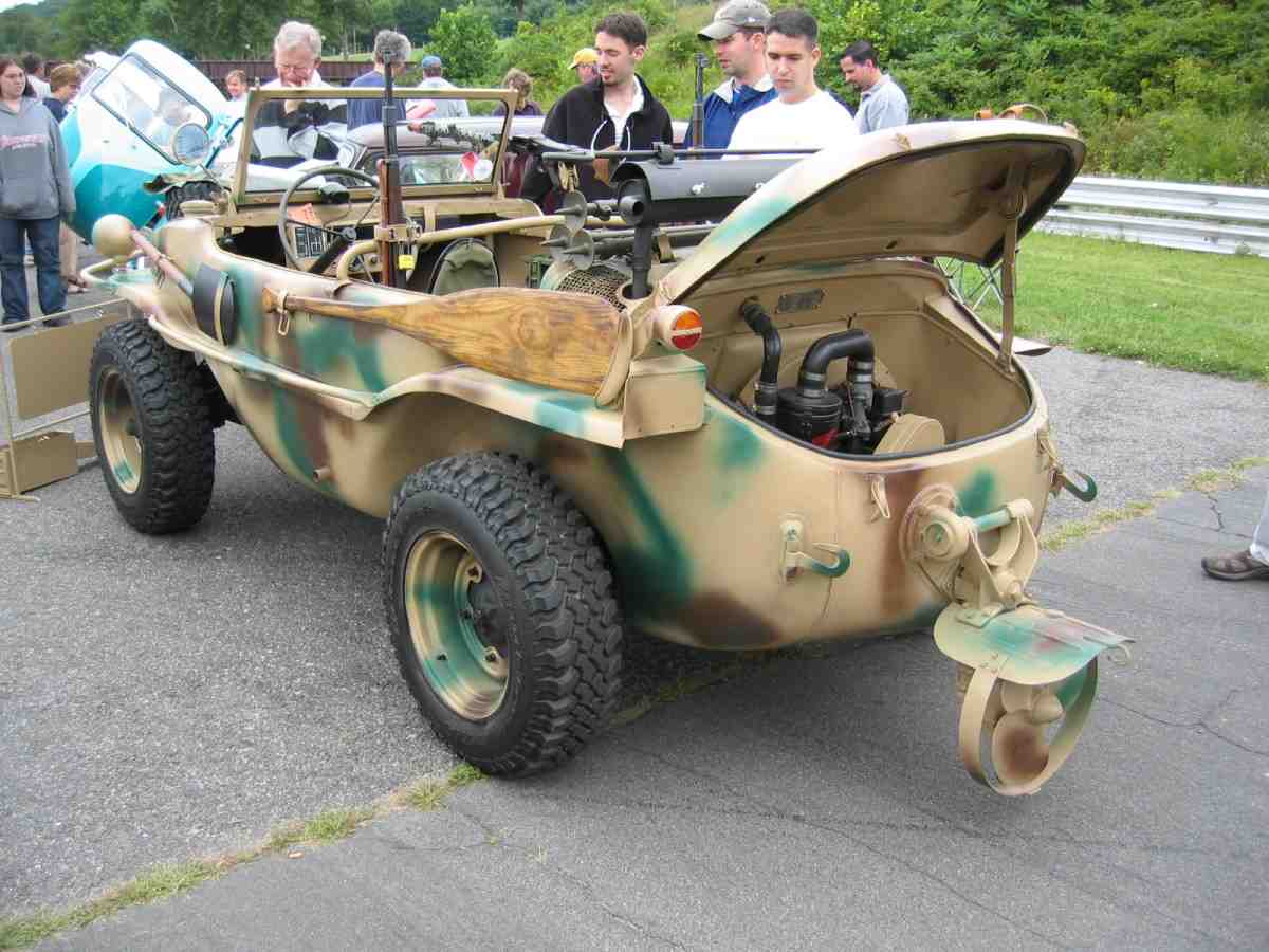 А теперь о настоящих плавающих автомобилях Volkswagen. Это были армейские полноприводные машины Volkswagen 166, созданные знаменитым конструктором Фердинантом Порше. С конца 1942 до октября 1944 года изготовили 14 283 такие амфибии. Стандартный «воздушник» мощностью 25 л.с., расположенный сзади, имел привод на откидной водоходный винт. Максимальная скорость по шоссе – 80 км/ч, а на плаву – до 10 км/ч.