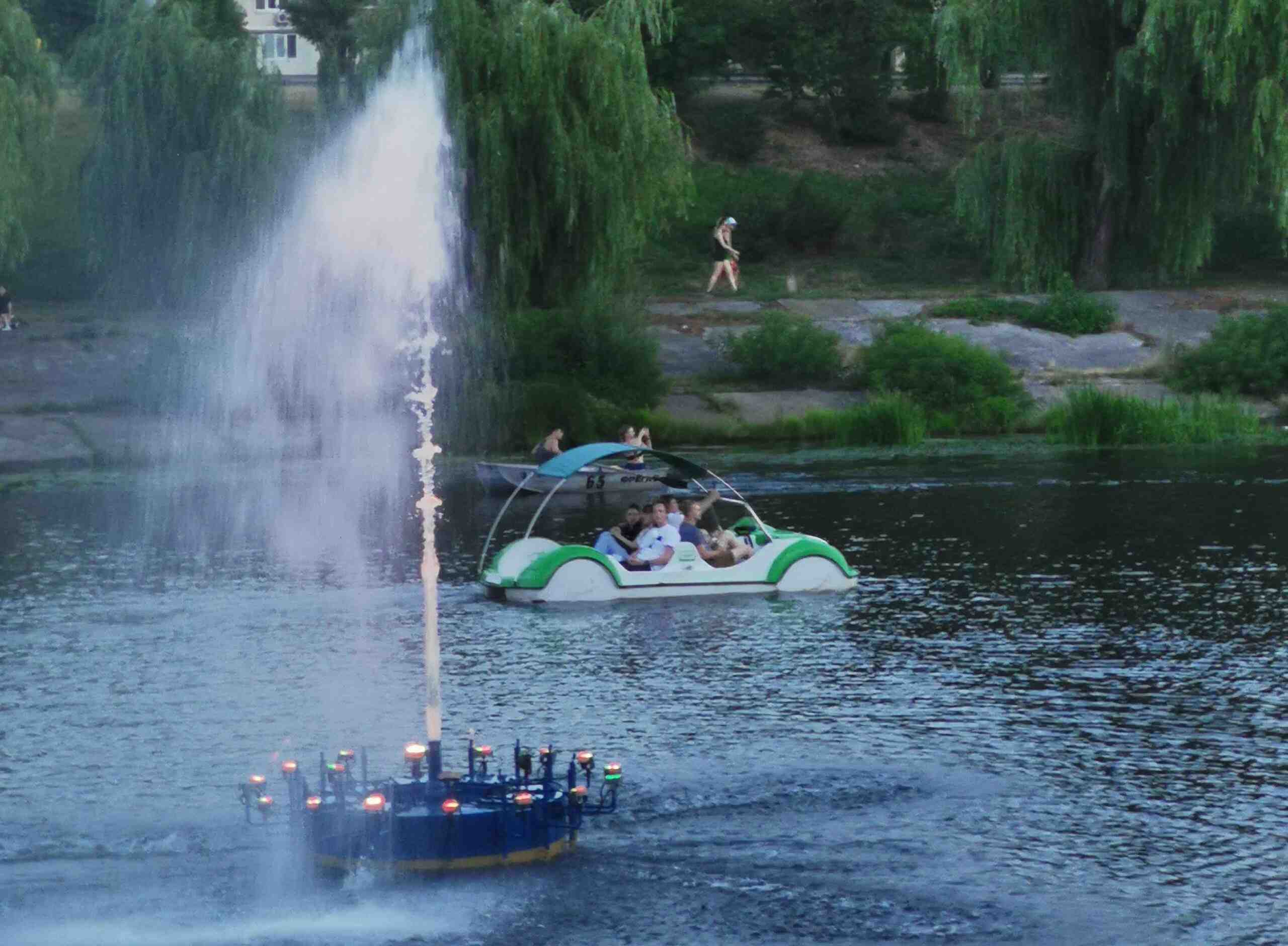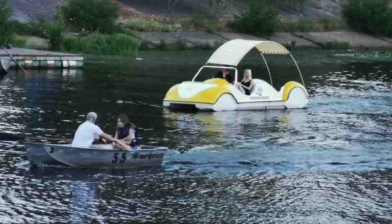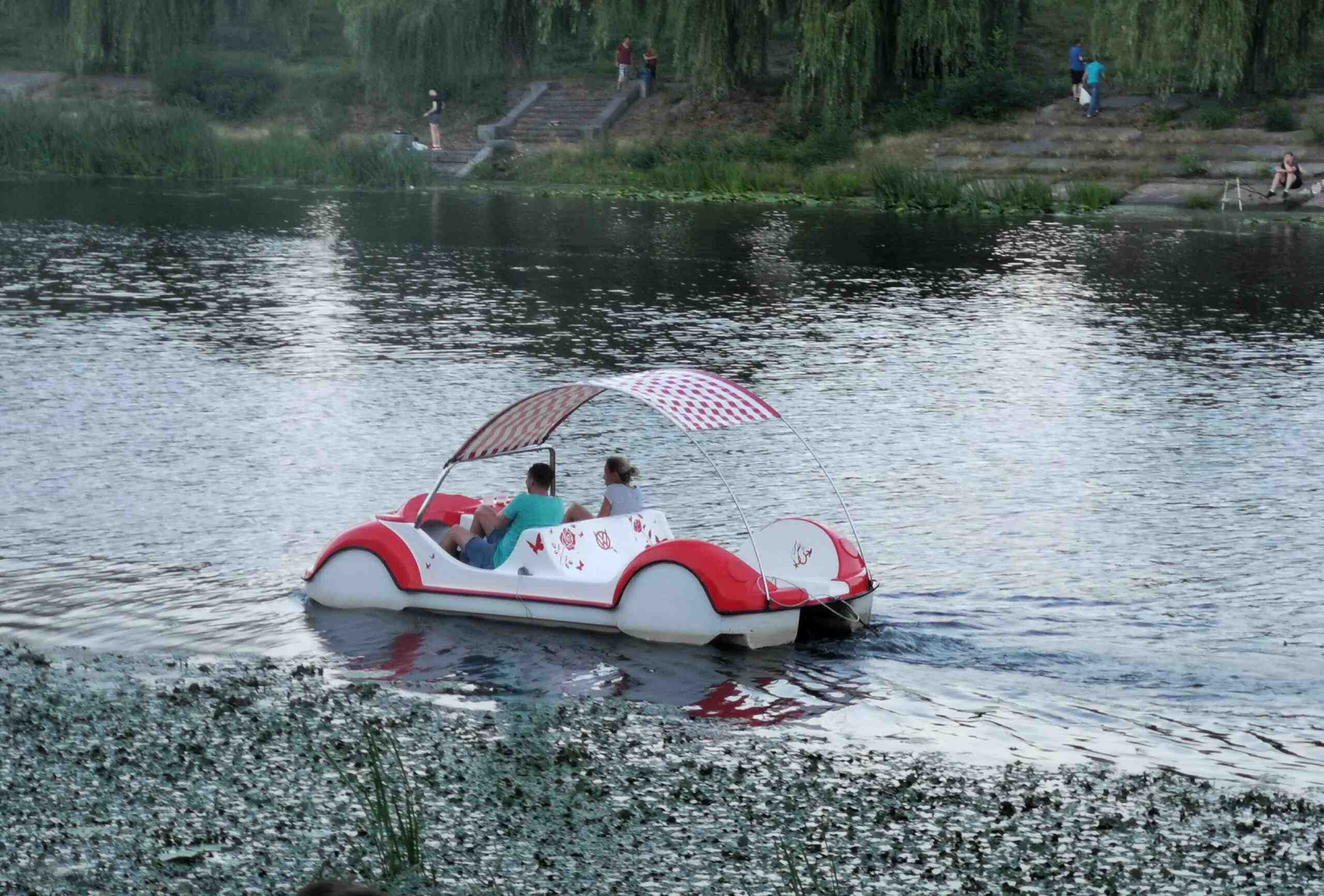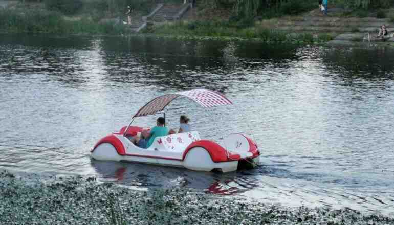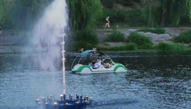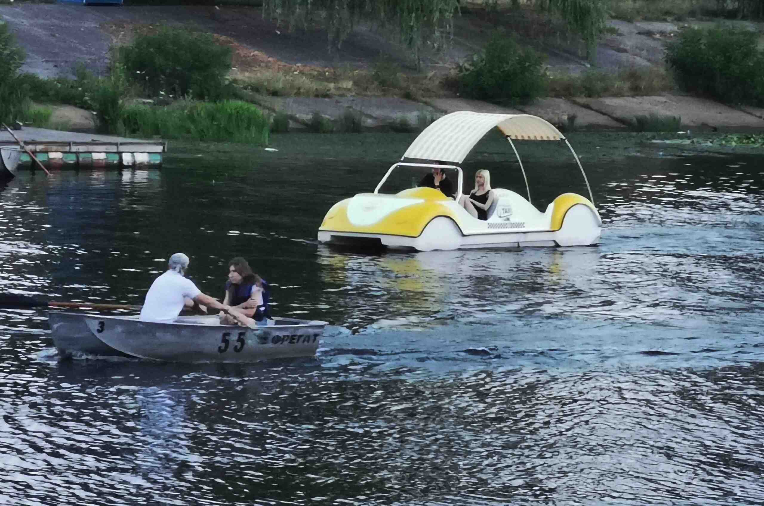 На Русановском канале в Киеве этим летом появился новый вид развлечения – катание на необычных с виду плавсредствах. Это катамараны, которые по дизайну довольно точно повторяют легендарный Volkswagen Beetle – достаточно посмотреть на характерные полукруглые крылья со светотехникой.