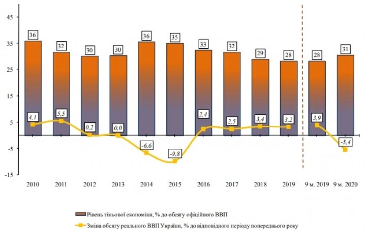 Уровень теневой экономики в январе-сентябре 2020 года составил 31% от объема официального валового внутреннего продукта (ВВП) Украины. Это на на 3 п.п. больше показателя января-сентября 2019 года.