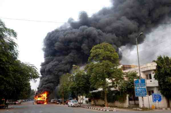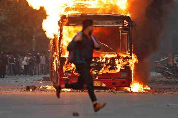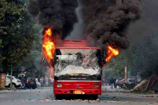 Автобус, который был подожжен демонстрантами во время протестов против нового закона о гражданстве в Нью-Дели.