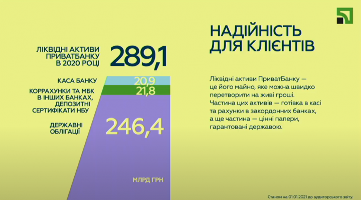 Ликвидные активы ПриватБанка по предварительным результатам 2020 года составляют 289,1 млрд грн. При этом в кассах банка хранилось еще 20,9 млрд грн.
