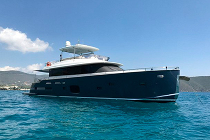 Согласно тексту предложения, моторное судно Azimut Magellano голубого цвета, изготовленное итальянской верфью Azimut Yachts, имеет четыре каюты и семь спальных мест. 24-метровая яхта оснащена судовыми 8-цилиндровыми двигателями мощностью в тысячу лошадиных сил, которые позволяют развивать скорость в 23 узла.