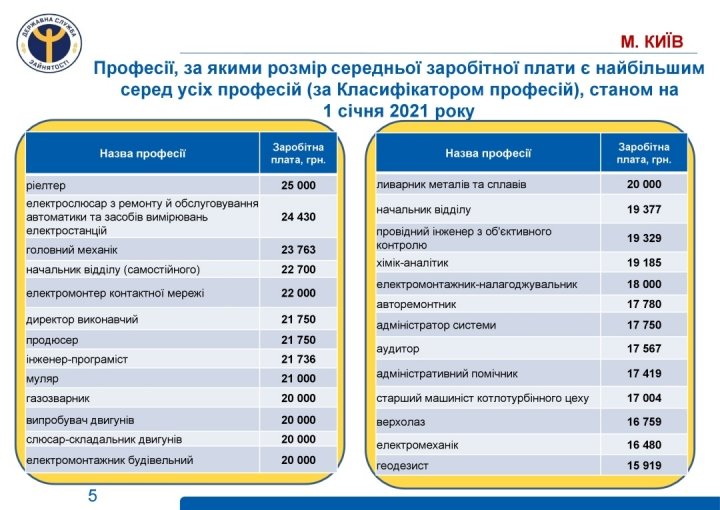 «На данный момент шкала самых высокооплачиваемых вакансий в базе столичной службы занятости выглядит следующим образом: самый высокий средний размер оплаты труда предлагается в вакансиях для риелтора (25 тыс. грн), электрослесаря ​​по ремонту и обслуживанию автоматики и средств измерений электростанций (24,4 тыс. грн), главного механика (23,8 тыс. грн)», — говорится в сообщении.