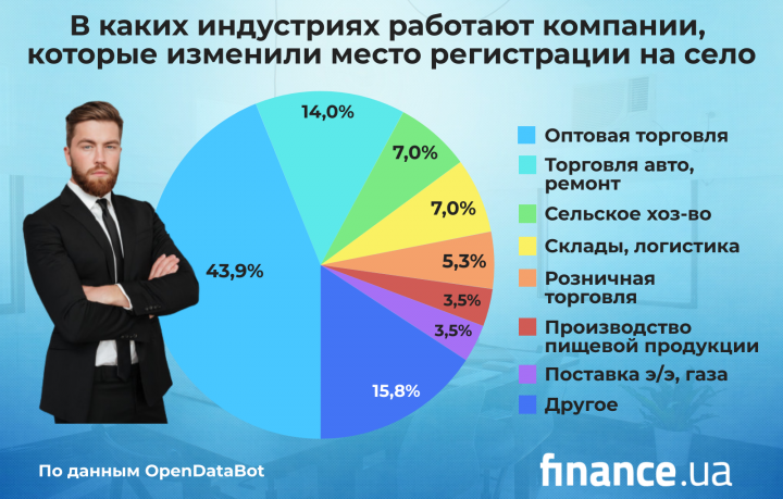 Половина компаний, которые переехали в села – 25 бизнесов – работает в сфере оптовой торговли. 8 предприятий задействованы в сфере торговли автотранспортными средствами и мотоциклами, или их ремонта.