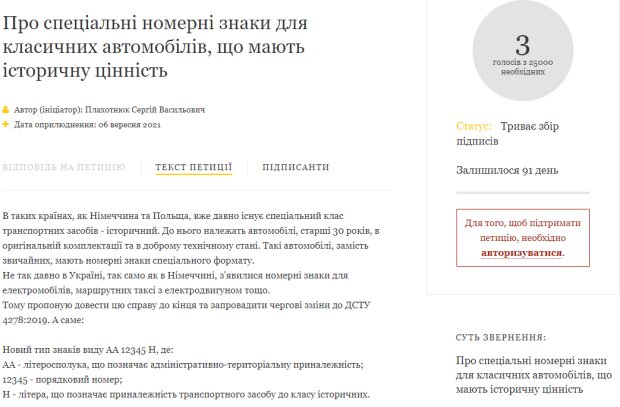 На на сайте Офиса президента размещена петиция с предложением о введении специальных номерных знаков для автомобилей, имеющих историческую ценность, передает newsyou.info.